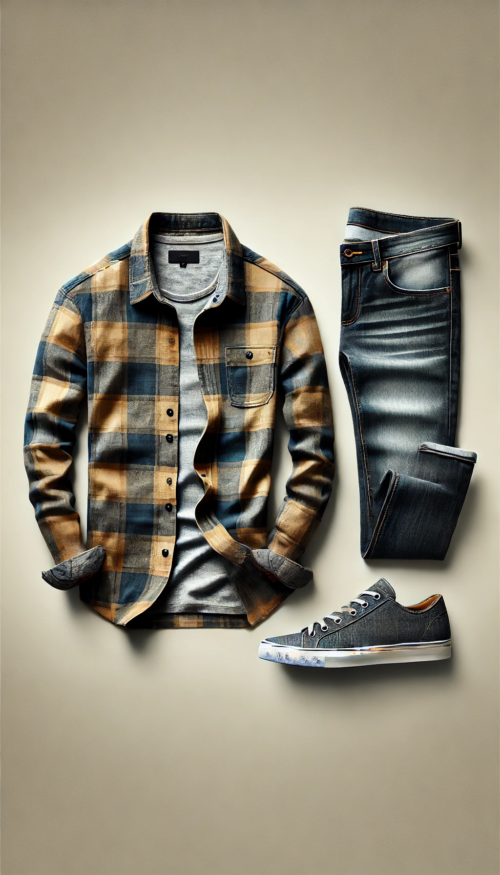 The Flannel Casual Set features a relaxed button-up flannel shirt paired with slim-fit jeans. This outfit provides a laid-back yet stylish look, perfect for weekend outings or casual gatherings.