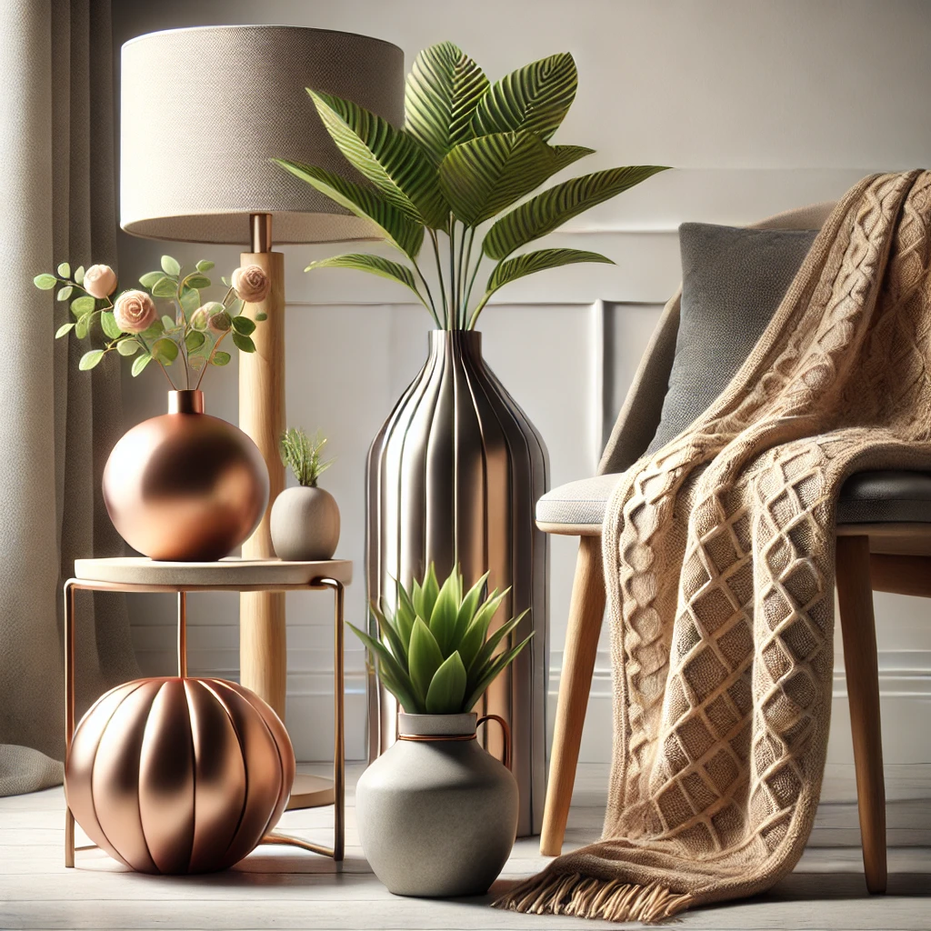 Elevate your living space with the Modern Comfort Decor Set, featuring a sleek decorative vase, a stylish table lamp, a small indoor plant in a modern pot, and a cozy throw blanket. These carefully curated pieces blend contemporary design with comfort, perfect for creating a warm and inviting atmosphere in any home.